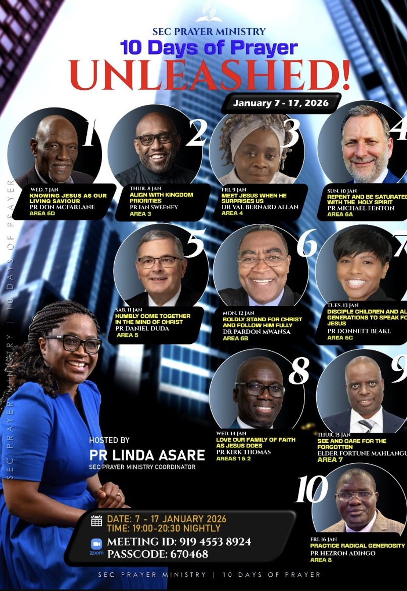 Each evening will be hosted online by the SEC Prayer Ministry Coordinator, Pastor Linda Asare, with guest speakers joining from across the SEC. All are encouraged to take part in this special time of renewal and prayer.