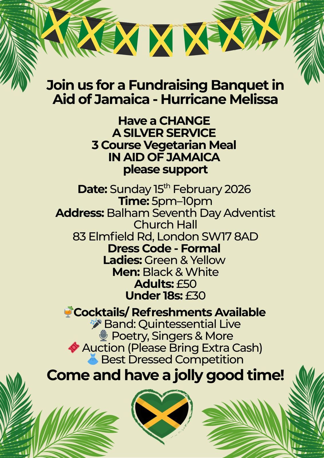 Join us for a Fundraising Banquet in aid of Jamaica, supporting those affected by Hurricane Melissa. Enjoy a silver-service, three-course vegetarian meal and an evening of entertainment and fellowship.